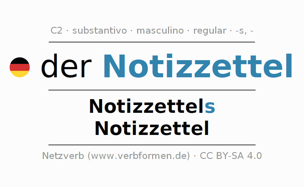 - Singular: der Notizzettel, des Notizzettels, dem Notizzettel, den Notizzettel