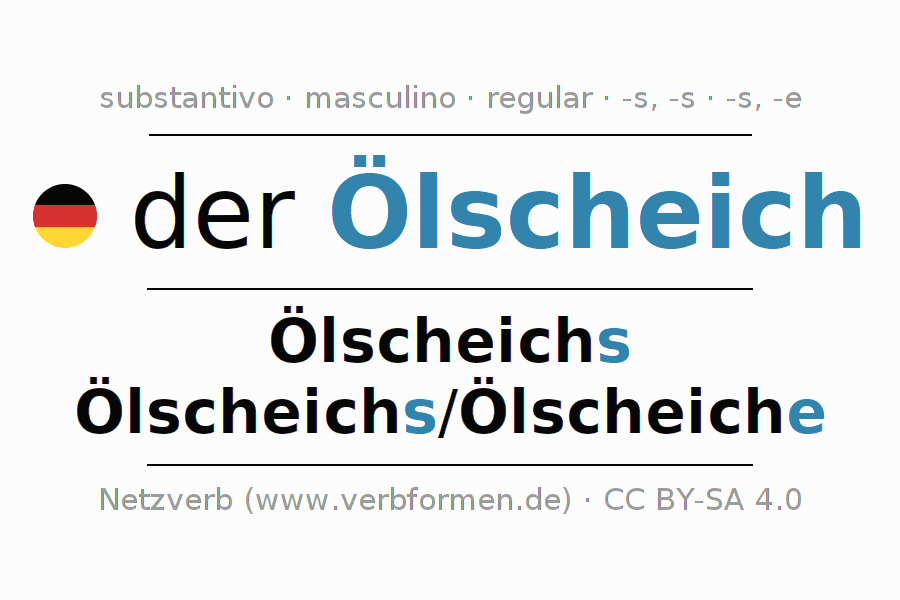 Declinação de Ölscheich é apresentada em uma tabela com todas as formas no singular e no plural (plural) e em todos os quatro casos: nominativo (1º caso), genitivo (2º caso), dativo (3º caso) e acusativo (4º caso) . Especialmente para os alunos de alemão, a correta declinação da palavra Ölscheich é fundamental.