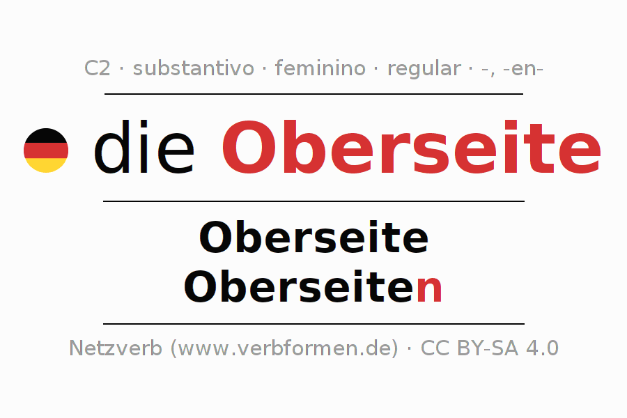 A declinação do substantivo Oberseite (face superior, lado de cima) está no genitivo singular Oberseite e no nominativo plural Oberseiten . O substantivo fraco Oberseite é declinado com a terminação -/n. O gênero gramatical de Oberseite é feminino e o artigo definido é "die". Não se pode somente declinar o substantivo Oberseite mas sim todos os substantivos em alemão. O substantivo faz parte do vocabulário referente ao Certificado em Alemão do Nível C2. Comentários ☆