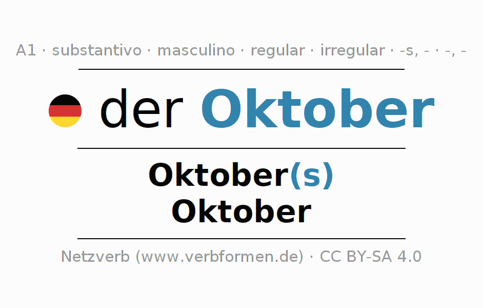 Declinação de Oktober é apresentada em uma tabela com todas as formas no singular e no plural (plural) e em todos os quatro casos: nominativo (1º caso), genitivo (2º caso), dativo (3º caso) e acusativo (4º caso) . Especialmente para os alunos de alemão, a correta declinação da palavra Oktober é fundamental.