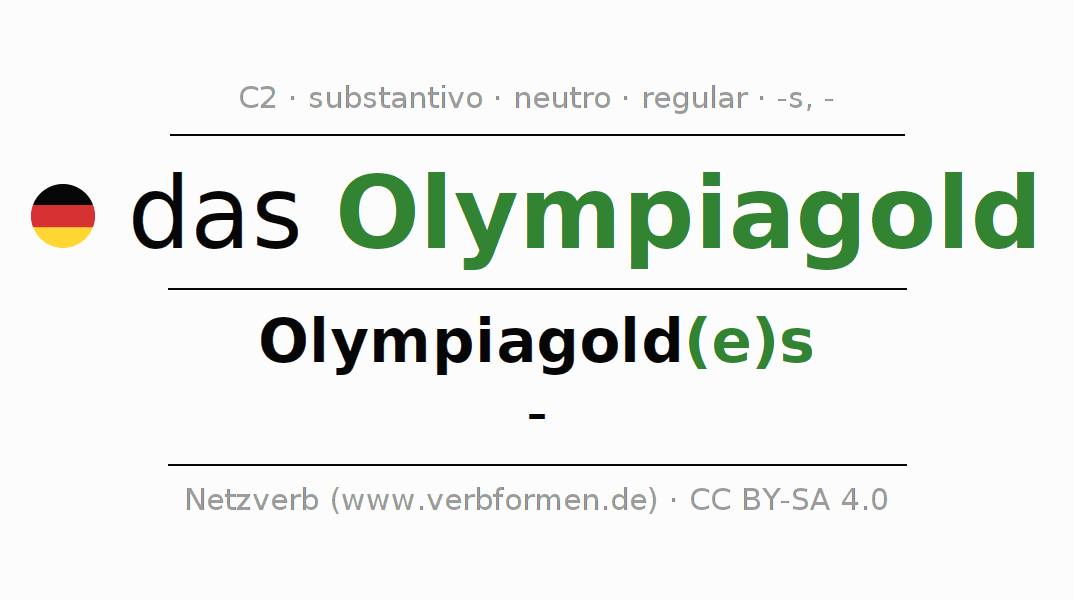 A declinação do substantivo Olympiagold (medalha de ouro) está no genitivo singular Olympiagold(e)s e no nominativo plural - . O substantivo forte Olympiagold é declinado com a terminação es/-. Não há formas no plural. O gênero gramatical de Olympiagold é neutro e o artigo definido é "das". Não se pode somente declinar o substantivo Olympiagold mas sim todos os substantivos em alemão. O substantivo faz parte do vocabulário referente ao Certificado em Alemão do Nível C2. Comentários ☆