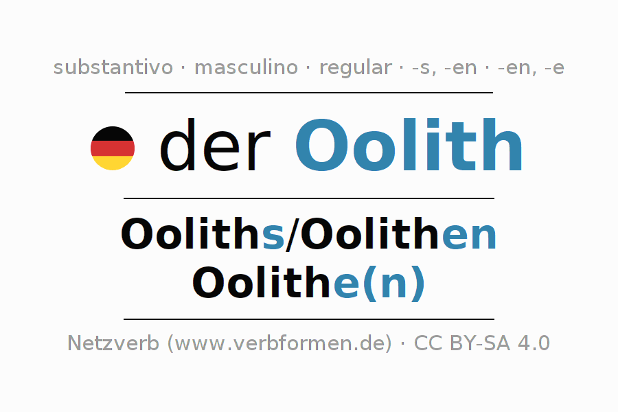 A declinação do substantivo Oolith (oolito) está no genitivo singular Ooliths/Oolithen e no nominativo plural Oolithe(n) . O substantivo misto Oolith é declinado com a terminação s/en/en/e. O gênero gramatical de Oolith é masculino e o artigo definido é 'der'. Não se pode somente declinar o substantivo Oolith mas sim todos os substantivos em alemão. Comentários ☆