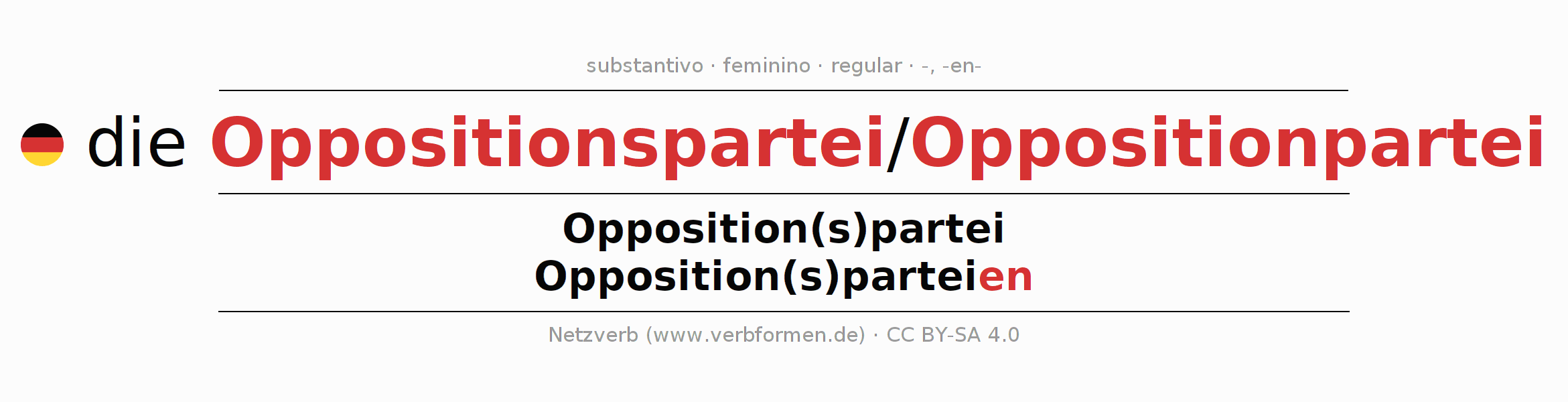 - Singular: die Opposition(s)partei, der Opposition(s)partei, der Opposition(s)partei, die Opposition(s)partei