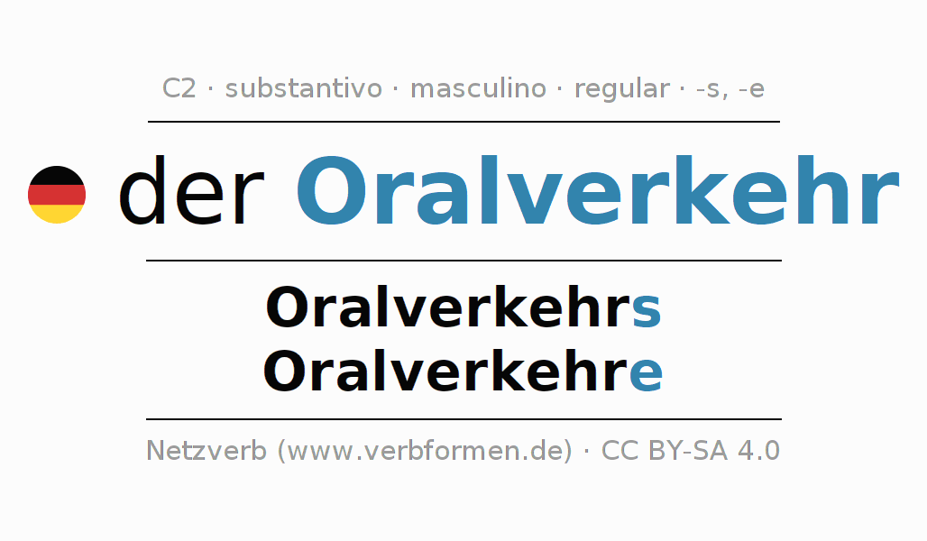 Declinação de Oralverkehr é apresentada em uma tabela com todas as formas no singular e no plural (plural) e em todos os quatro casos: nominativo (1º caso), genitivo (2º caso), dativo (3º caso) e acusativo (4º caso) . Especialmente para os alunos de alemão, a correta declinação da palavra Oralverkehr é fundamental.