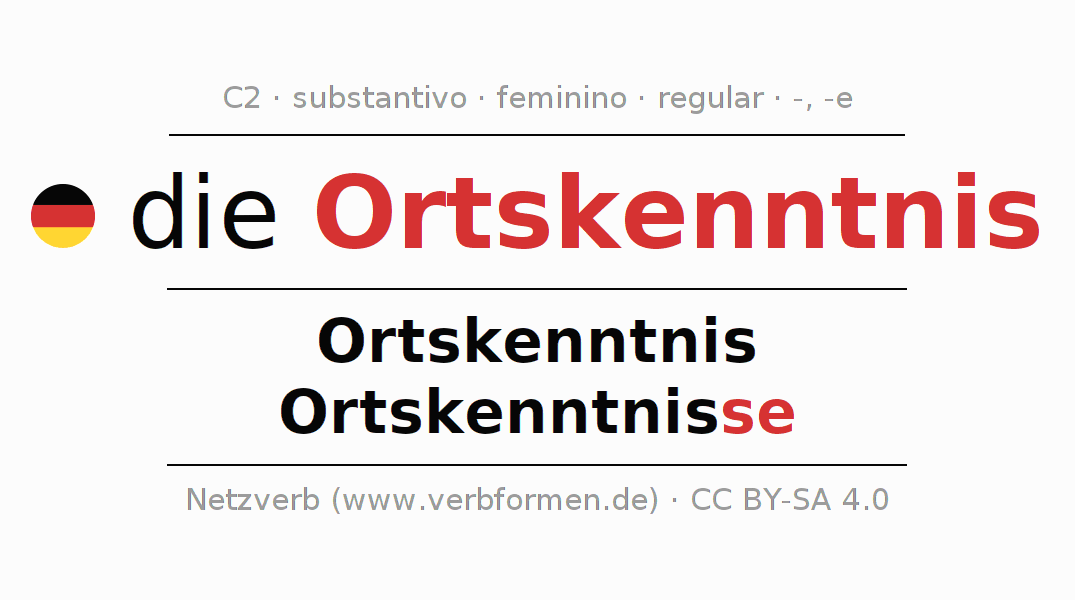 A declinação do substantivo Ortskenntnis (conhecimento da área, conhecimento local) está no genitivo singular Ortskenntnis e no nominativo plural Ortskenntnisse . O substantivo forte Ortskenntnis é declinado com a terminação -/se. O gênero gramatical de Ortskenntnis é feminino e o artigo definido é "die". Não se pode somente declinar o substantivo Ortskenntnis mas sim todos os substantivos em alemão. O substantivo faz parte do vocabulário referente ao Certificado em Alemão do Nível C2. Comentários ☆