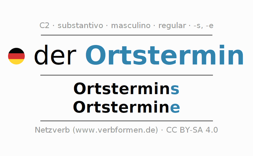 Declinação de Ortstermin é apresentada em uma tabela com todas as formas no singular e no plural (plural) e em todos os quatro casos: nominativo (1º caso), genitivo (2º caso), dativo (3º caso) e acusativo (4º caso) . Especialmente para os alunos de alemão, a correta declinação da palavra Ortstermin é fundamental.