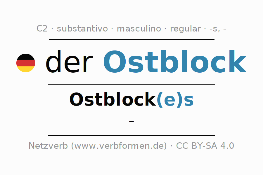 A declinação do substantivo Ostblock (Bloco Oriental, Bloco de Leste) está no genitivo singular Ostblock(e)s e no nominativo plural - . O substantivo forte Ostblock é declinado com a terminação es/-. Não há formas no plural. O gênero gramatical de Ostblock é masculino e o artigo definido é 'der'. Não se pode somente declinar o substantivo Ostblock mas sim todos os substantivos em alemão. O substantivo faz parte do vocabulário referente ao Certificado em Alemão do Nível C2. Comentários ☆