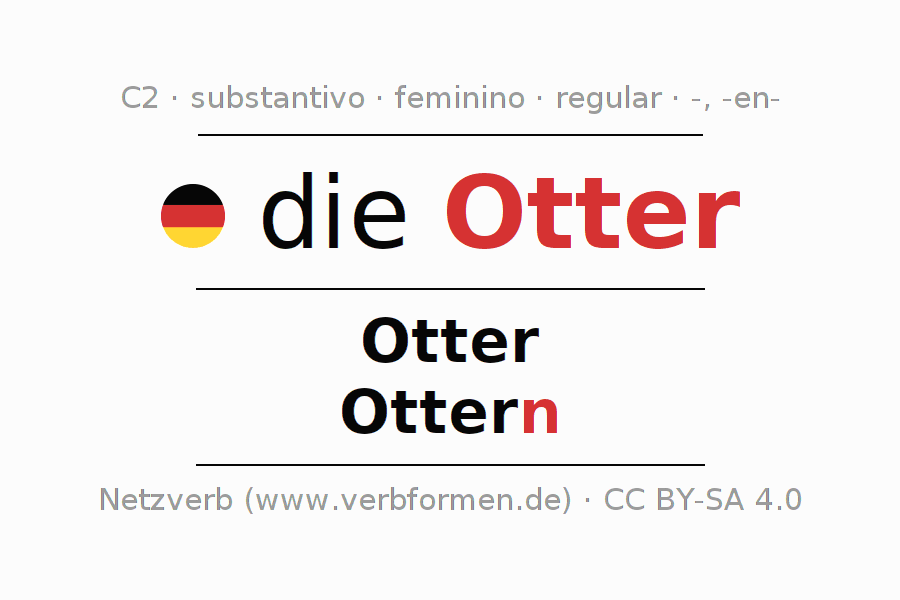 Declinação de Otter é apresentada em uma tabela com todas as formas no singular e no plural (plural) e em todos os quatro casos: nominativo (1º caso), genitivo (2º caso), dativo (3º caso) e acusativo (4º caso) . Especialmente para os alunos de alemão, a correta declinação da palavra Otter é fundamental.
