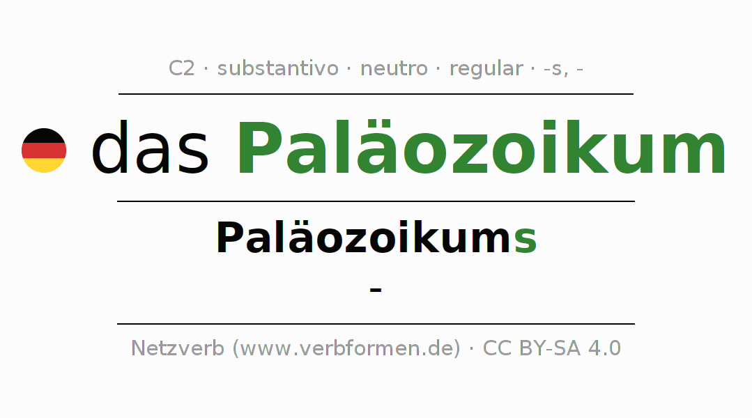 A declinação do substantivo Paläozoikum (Paleozoico, Paleozóico) está no genitivo singular Paläozoikums e no nominativo plural - . O substantivo forte Paläozoikum é declinado com a terminação s/-. Não há formas no plural. O gênero gramatical de Paläozoikum é neutro e o artigo definido é "das". Não se pode somente declinar o substantivo Paläozoikum mas sim todos os substantivos em alemão. O substantivo faz parte do vocabulário referente ao Certificado em Alemão do Nível C2. Comentários ☆