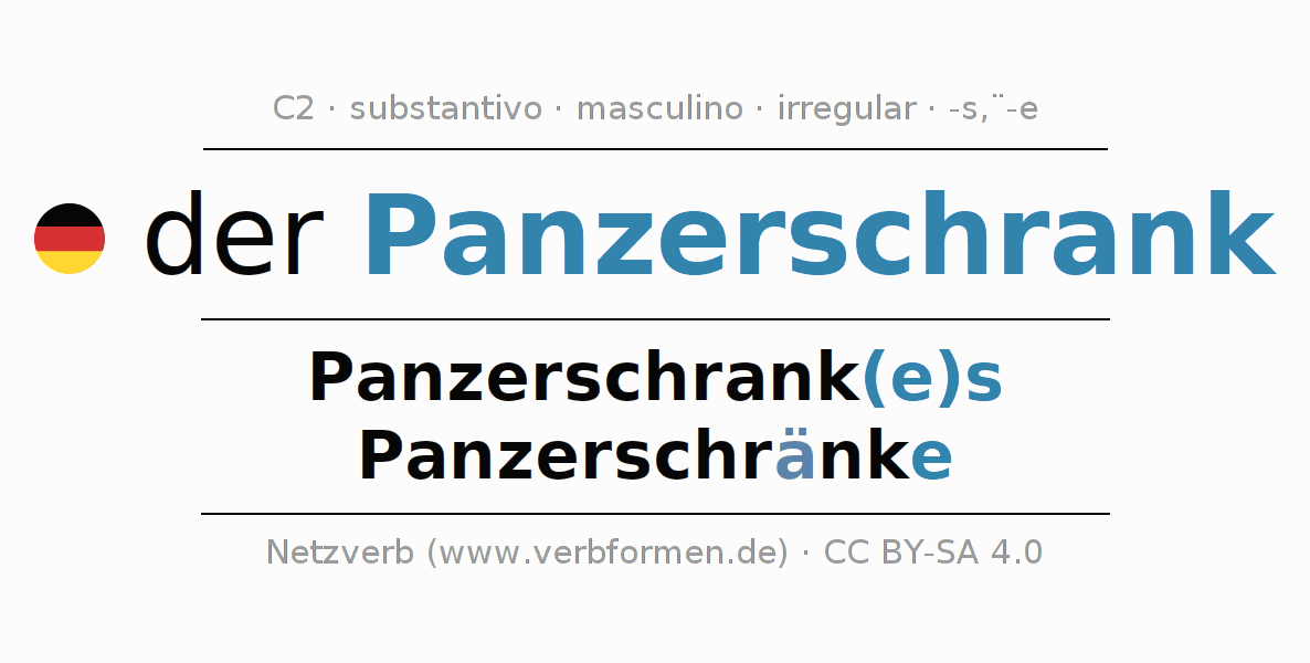 A declinação do substantivo Panzerschrank (cofre-forte, armário blindado) está no genitivo singular Panzerschrank(e)s e no nominativo plural Panzerschränke . O substantivo forte Panzerschrank é declinado com a terminação es/ä-e. No plural com um trema. O gênero gramatical de Panzerschrank é masculino e o artigo definido é 'der'. Não se pode somente declinar o substantivo Panzerschrank mas sim todos os substantivos em alemão. O substantivo faz parte do vocabulário referente ao Certificado em Alemão do Nível C2. Comentários ☆