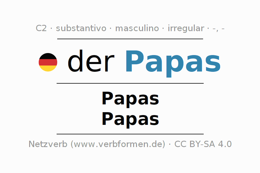 Declinação de Papas é apresentada em uma tabela com todas as formas no singular e no plural (plural) e em todos os quatro casos: nominativo (1º caso), genitivo (2º caso), dativo (3º caso) e acusativo (4º caso) . Especialmente para os alunos de alemão, a correta declinação da palavra Papas é fundamental.