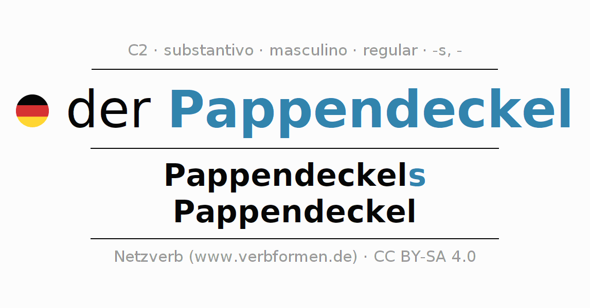 Declinação de Pappendeckel é apresentada em uma tabela com todas as formas no singular e no plural (plural) e em todos os quatro casos: nominativo (1º caso), genitivo (2º caso), dativo (3º caso) e acusativo (4º caso) . Especialmente para os alunos de alemão, a correta declinação da palavra Pappendeckel é fundamental.