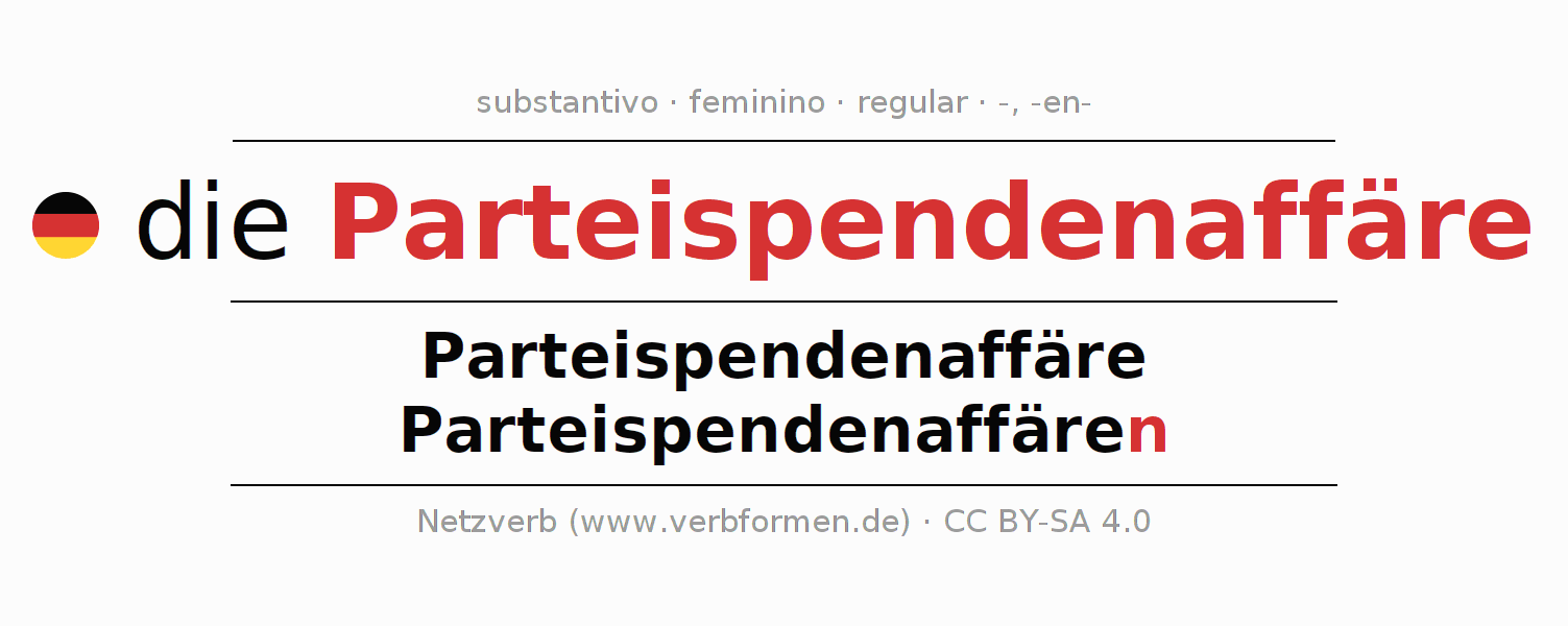 A declinação do substantivo Parteispendenaffäre (escândalo de doações partidárias) está no genitivo singular Parteispendenaffäre e no nominativo plural Parteispendenaffären . O substantivo fraco Parteispendenaffäre é declinado com a terminação -/n. O gênero gramatical de Parteispendenaffäre é feminino e o artigo definido é "die". Não se pode somente declinar o substantivo Parteispendenaffäre mas sim todos os substantivos em alemão. Comentários ☆