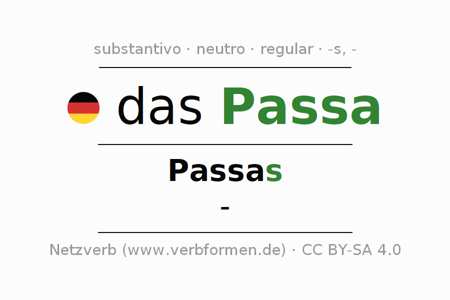 Declinação de Passa é apresentada em uma tabela com todas as formas no singular e no plural (plural) e em todos os quatro casos: nominativo (1º caso), genitivo (2º caso), dativo (3º caso) e acusativo (4º caso) . Especialmente para os alunos de alemão, a correta declinação da palavra Passa é fundamental.