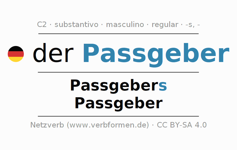 A declinação do substantivo Passgeber (passador) está no genitivo singular Passgebers e no nominativo plural Passgeber . O substantivo forte Passgeber é declinado com a terminação s/-. O gênero gramatical de Passgeber é masculino e o artigo definido é 'der'. Não se pode somente declinar o substantivo Passgeber mas sim todos os substantivos em alemão. O substantivo faz parte do vocabulário referente ao Certificado em Alemão do Nível C2. Comentários ☆