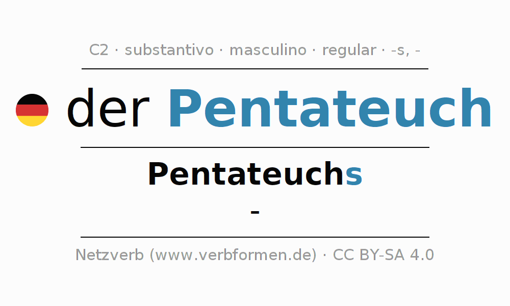 A declinação do substantivo Pentateuch (Pentateuco) está no genitivo singular Pentateuchs e no nominativo plural - . O substantivo forte Pentateuch é declinado com a terminação s/-. Não há formas no plural. O gênero gramatical de Pentateuch é masculino e o artigo definido é 'der'. Não se pode somente declinar o substantivo Pentateuch mas sim todos os substantivos em alemão. O substantivo faz parte do vocabulário referente ao Certificado em Alemão do Nível C2. Comentários ☆
