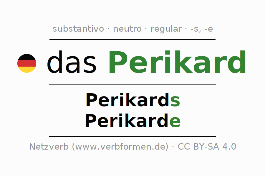 A declinação do substantivo Perikard (pericárdio) está no genitivo singular Perikards e no nominativo plural Perikarde . O substantivo forte Perikard é declinado com a terminação s/e. O gênero gramatical de Perikard é neutro e o artigo definido é "das". Não se pode somente declinar o substantivo Perikard mas sim todos os substantivos em alemão. Comentários ☆