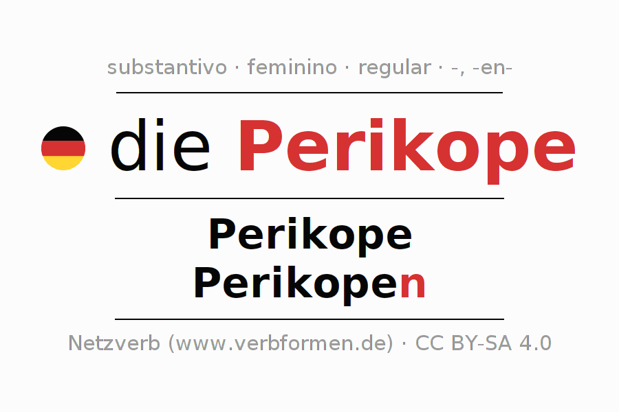 A declinação do substantivo Perikope (pericope) está no genitivo singular Perikope e no nominativo plural Perikopen . O substantivo fraco Perikope é declinado com a terminação -/n. O gênero gramatical de Perikope é feminino e o artigo definido é "die". Não se pode somente declinar o substantivo Perikope mas sim todos os substantivos em alemão. Comentários ☆