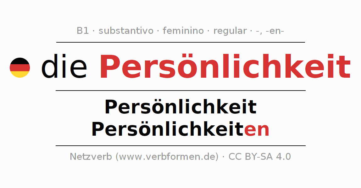 Declinação de Persönlichkeit é apresentada em uma tabela com todas as formas no singular e no plural (plural) e em todos os quatro casos: nominativo (1º caso), genitivo (2º caso), dativo (3º caso) e acusativo (4º caso) . Especialmente para os alunos de alemão, a correta declinação da palavra Persönlichkeit é fundamental.
