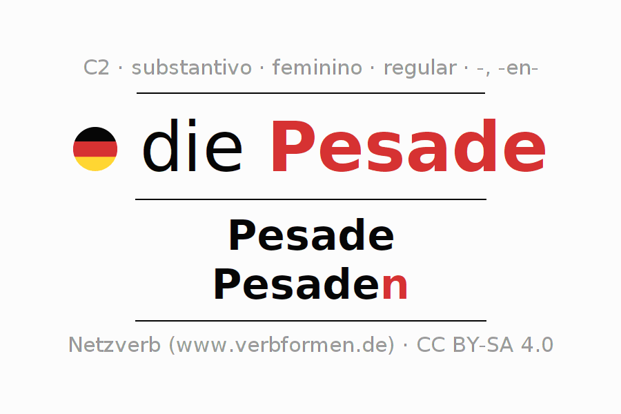 Declinação de Pesade é apresentada em uma tabela com todas as formas no singular e no plural (plural) e em todos os quatro casos: nominativo (1º caso), genitivo (2º caso), dativo (3º caso) e acusativo (4º caso) . Especialmente para os alunos de alemão, a correta declinação da palavra Pesade é fundamental.
