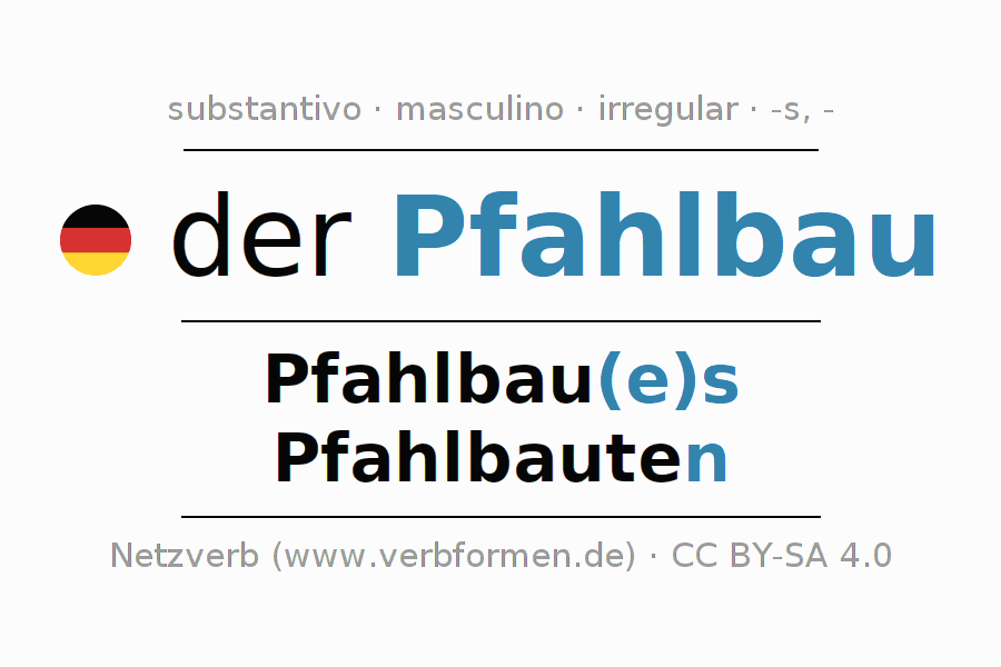 A declinação do substantivo Pfahlbau (construção lacustre, edifício sobre estacas) está no genitivo singular Pfahlbau(e)s e no nominativo plural - . O substantivo Pfahlbau é declinado com as terminações es/-. Não há formas no plural. No plural, no entanto, as formas de Pfahlbauten são possíveis. O gênero gramatical de Pfahlbau é masculino e o artigo definido é 'der'. Não se pode somente declinar o substantivo Pfahlbau mas sim todos os substantivos em alemão. Comentários ☆