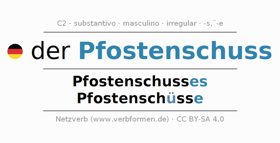 Declinação de Pfostenschuss é apresentada em uma tabela com todas as formas no singular e no plural (plural) e em todos os quatro casos: nominativo (1º caso), genitivo (2º caso), dativo (3º caso) e acusativo (4º caso) . Especialmente para os alunos de alemão, a correta declinação da palavra Pfostenschuss é fundamental.