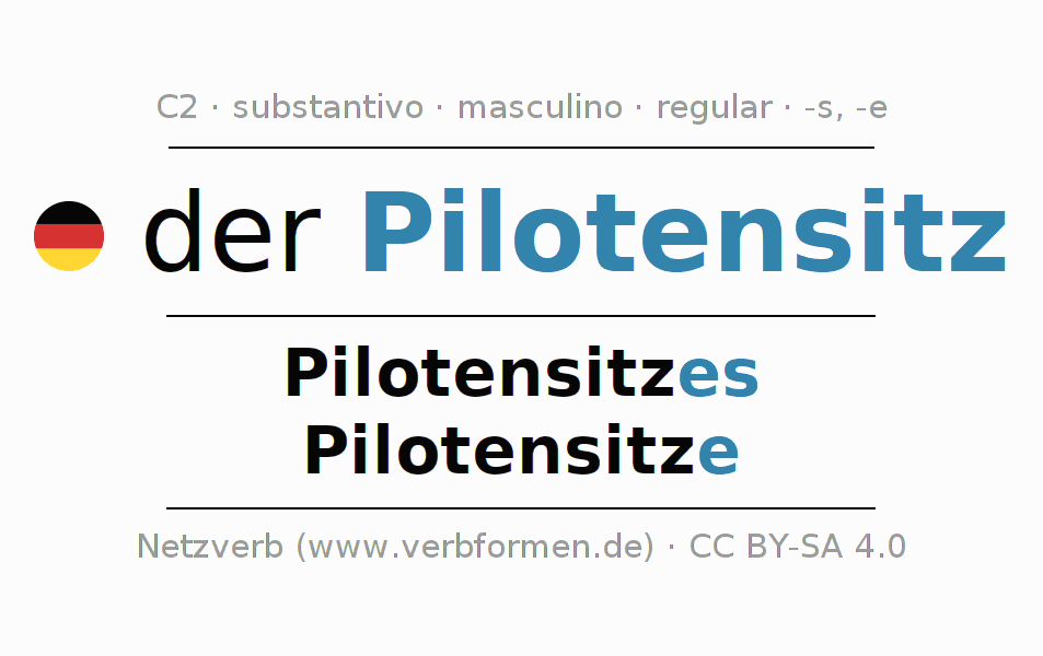 Declinação de Pilotensitz é apresentada em uma tabela com todas as formas no singular e no plural (plural) e em todos os quatro casos: nominativo (1º caso), genitivo (2º caso), dativo (3º caso) e acusativo (4º caso) . Especialmente para os alunos de alemão, a correta declinação da palavra Pilotensitz é fundamental.