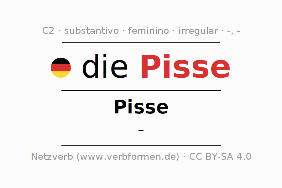 Declinação de Pisse é apresentada em uma tabela com todas as formas no singular e no plural (plural) e em todos os quatro casos: nominativo (1º caso), genitivo (2º caso), dativo (3º caso) e acusativo (4º caso) . Especialmente para os alunos de alemão, a correta declinação da palavra Pisse é fundamental.