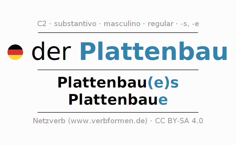 Declinação de Plattenbau é apresentada em uma tabela com todas as formas no singular e no plural (plural) e em todos os quatro casos: nominativo (1º caso), genitivo (2º caso), dativo (3º caso) e acusativo (4º caso) . Especialmente para os alunos de alemão, a correta declinação da palavra Plattenbau é fundamental.