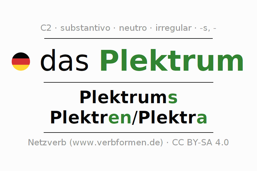 A declinação do substantivo Plektrum (palheta, plectro) está no genitivo singular Plektrums e no nominativo plural Plektren/Plektra . O substantivo Plektrum é declinado com as terminações s/en/a. O gênero gramatical de Plektrum é neutro e o artigo definido é "das". Não se pode somente declinar o substantivo Plektrum mas sim todos os substantivos em alemão. O substantivo faz parte do vocabulário referente ao Certificado em Alemão do Nível C2. Comentários ☆