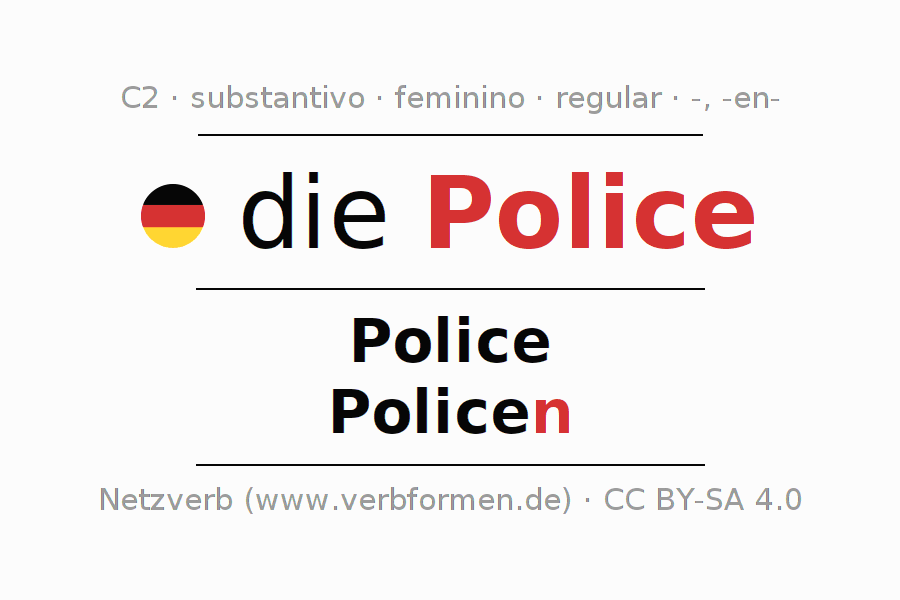 Declinação de Police é apresentada em uma tabela com todas as formas no singular e no plural (plural) e em todos os quatro casos: nominativo (1º caso), genitivo (2º caso), dativo (3º caso) e acusativo (4º caso) . Especialmente para os alunos de alemão, a correta declinação da palavra Police é fundamental.