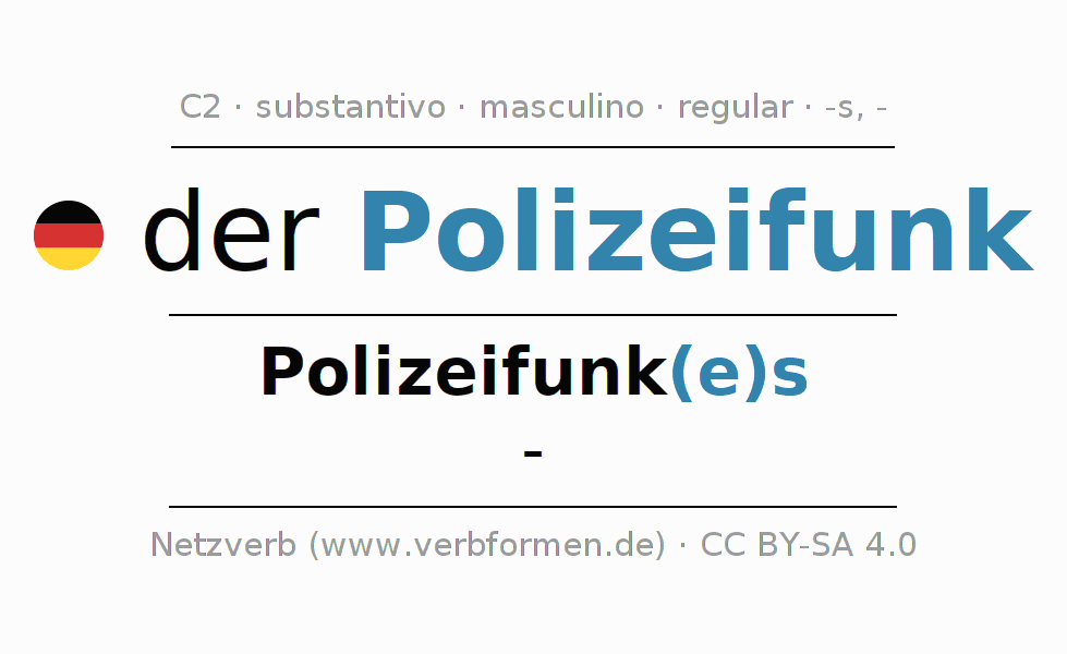 A declinação do substantivo Polizeifunk (rádio policial) está no genitivo singular Polizeifunk(e)s e no nominativo plural - . O substantivo forte Polizeifunk é declinado com a terminação es/s/-. Não há formas no plural. O gênero gramatical de Polizeifunk é masculino e o artigo definido é 'der'. Não se pode somente declinar o substantivo Polizeifunk mas sim todos os substantivos em alemão. O substantivo faz parte do vocabulário referente ao Certificado em Alemão do Nível C2. Comentários ☆