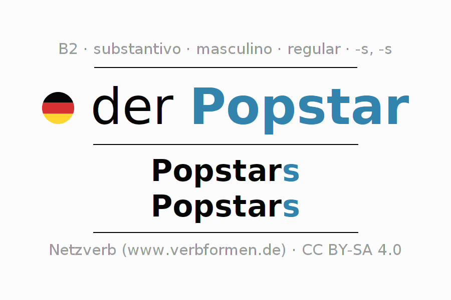 A declinação do substantivo Popstar (estrela pop) está no genitivo singular Popstars e no nominativo plural Popstars . O substantivo forte Popstar é declinado com a terminação s/s. O gênero gramatical de Popstar é masculino e o artigo definido é 'der'. Não se pode somente declinar o substantivo Popstar mas sim todos os substantivos em alemão. O substantivo faz parte do vocabulário referente ao Certificado em Alemão do Nível B2. Comentários ☆