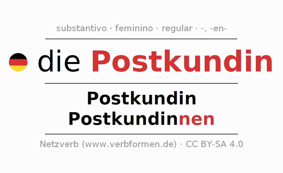 A declinação do substantivo Postkundin (cliente dos correios) está no genitivo singular Postkundin e no nominativo plural Postkundinnen . O substantivo fraco Postkundin é declinado com a terminação -/nen. O gênero gramatical de Postkundin é feminino e o artigo definido é "die". Não se pode somente declinar o substantivo Postkundin mas sim todos os substantivos em alemão. Comentários ☆