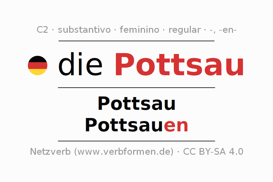 Declinação de Pottsau é apresentada em uma tabela com todas as formas no singular e no plural (plural) e em todos os quatro casos: nominativo (1º caso), genitivo (2º caso), dativo (3º caso) e acusativo (4º caso) . Especialmente para os alunos de alemão, a correta declinação da palavra Pottsau é fundamental.