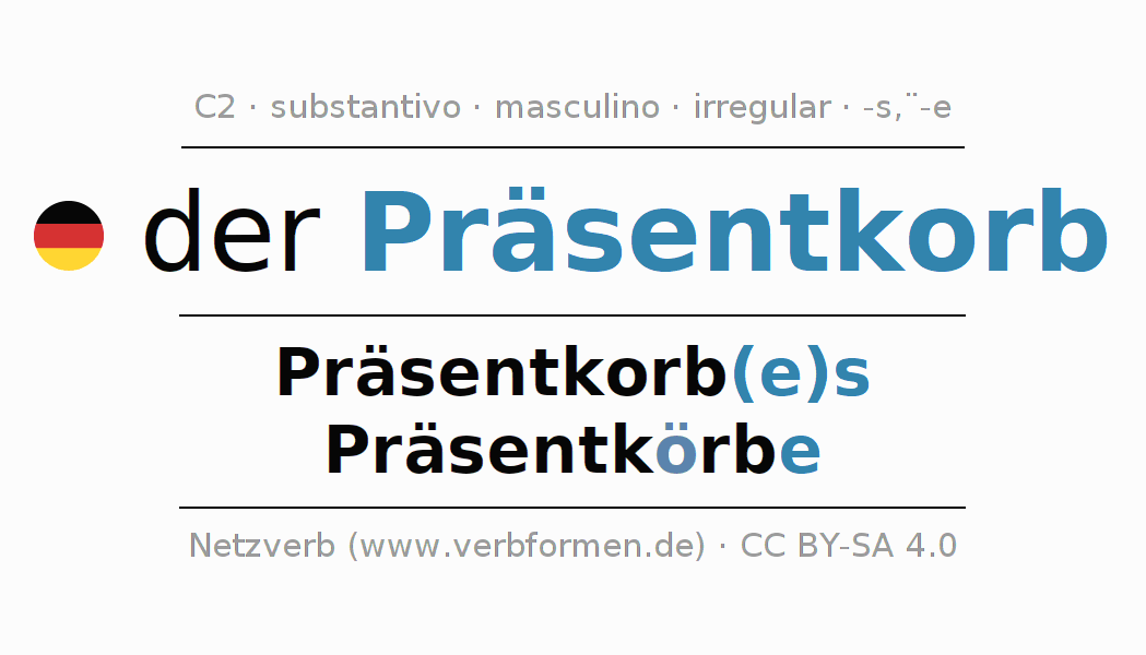 A declinação do substantivo Präsentkorb (cesta de presentes) está no genitivo singular Präsentkorb(e)s e no nominativo plural Präsentkörbe . O substantivo forte Präsentkorb é declinado com a terminação es/ö-e. No plural com um trema. O gênero gramatical de Präsentkorb é masculino e o artigo definido é 'der'. Não se pode somente declinar o substantivo Präsentkorb mas sim todos os substantivos em alemão. O substantivo faz parte do vocabulário referente ao Certificado em Alemão do Nível C2. Comentários ☆