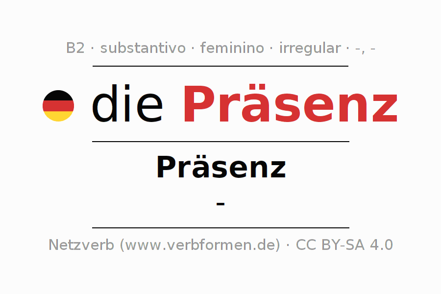Declinação de Präsenz é apresentada em uma tabela com todas as formas no singular e no plural (plural) e em todos os quatro casos: nominativo (1º caso), genitivo (2º caso), dativo (3º caso) e acusativo (4º caso) . Especialmente para os alunos de alemão, a correta declinação da palavra Präsenz é fundamental.
