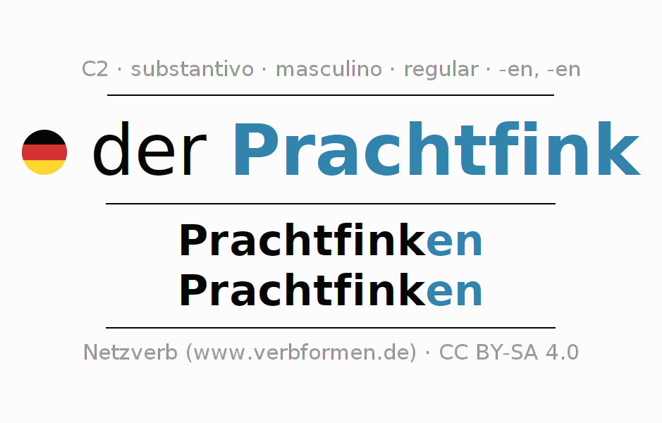 Declinação de Prachtfink é apresentada em uma tabela com todas as formas no singular e no plural (plural) e em todos os quatro casos: nominativo (1º caso), genitivo (2º caso), dativo (3º caso) e acusativo (4º caso) . Especialmente para os alunos de alemão, a correta declinação da palavra Prachtfink é fundamental.
