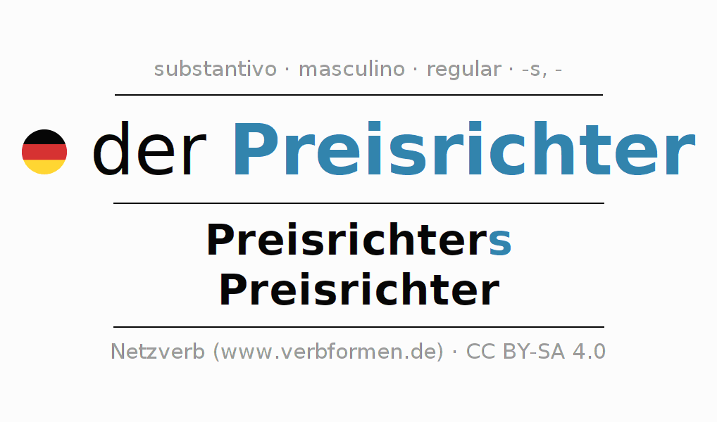 A declinação do substantivo Preisrichter (avaliador, juiz) está no genitivo singular Preisrichters e no nominativo plural Preisrichter . O substantivo forte Preisrichter é declinado com a terminação s/-. O gênero gramatical de Preisrichter é masculino e o artigo definido é 'der'. Não se pode somente declinar o substantivo Preisrichter mas sim todos os substantivos em alemão. Comentários ☆