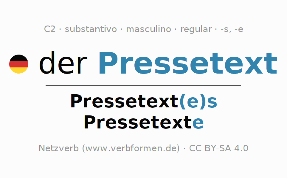 Declinação de Pressetext é apresentada em uma tabela com todas as formas no singular e no plural (plural) e em todos os quatro casos: nominativo (1º caso), genitivo (2º caso), dativo (3º caso) e acusativo (4º caso) . Especialmente para os alunos de alemão, a correta declinação da palavra Pressetext é fundamental.