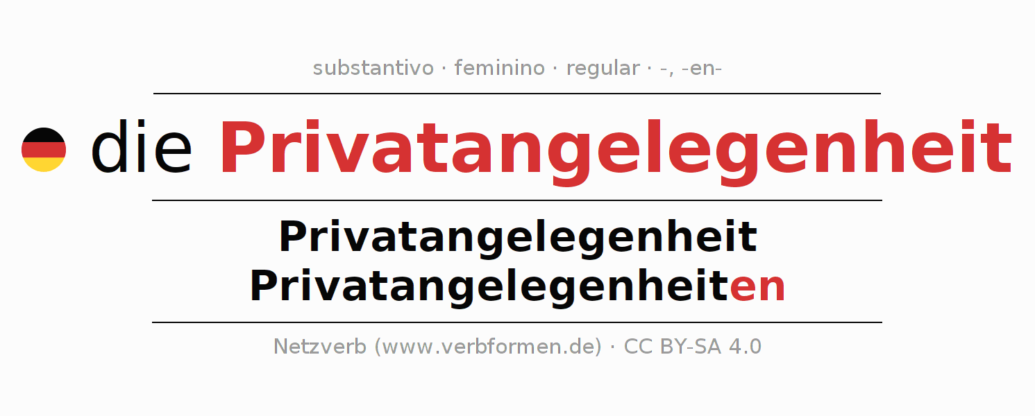 A declinação do substantivo Privatangelegenheit (assunto particular, assunto pessoal) está no genitivo singular Privatangelegenheit e no nominativo plural Privatangelegenheiten . O substantivo fraco Privatangelegenheit é declinado com a terminação -/en. O gênero gramatical de Privatangelegenheit é feminino e o artigo definido é "die". Não se pode somente declinar o substantivo Privatangelegenheit mas sim todos os substantivos em alemão. Comentários ☆