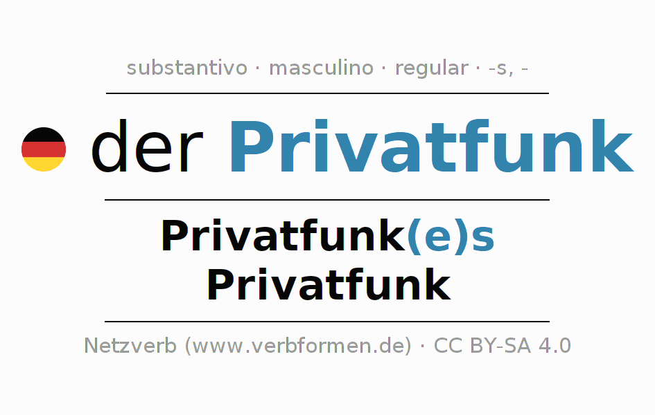A declinação do substantivo Privatfunk (rádio privado) está no genitivo singular Privatfunk(e)s e no nominativo plural Privatfunk . O substantivo forte Privatfunk é declinado com a terminação es/s/-. O gênero gramatical de Privatfunk é masculino e o artigo definido é 'der'. Não se pode somente declinar o substantivo Privatfunk mas sim todos os substantivos em alemão. Comentários ☆