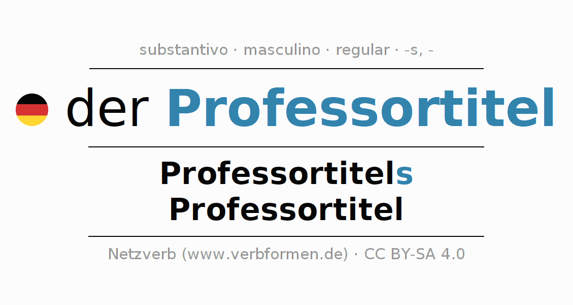 A declinação do substantivo Professortitel (título acadêmico, título de professor) está no genitivo singular Professortitels e no nominativo plural Professortitel . O substantivo forte Professortitel é declinado com a terminação s/-. O gênero gramatical de Professortitel é masculino e o artigo definido é 'der'. Não se pode somente declinar o substantivo Professortitel mas sim todos os substantivos em alemão. Comentários ☆