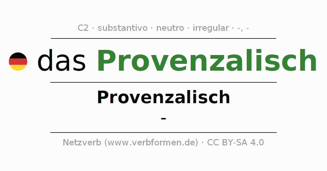 A declinação do substantivo Provenzalisch (provençal) está no genitivo singular Provenzalisch e no nominativo plural - . O substantivo Provenzalisch é declinado com as terminações -/-. Não há formas no plural. O gênero gramatical de Provenzalisch é neutro e o artigo definido é "das". Não se pode somente declinar o substantivo Provenzalisch mas sim todos os substantivos em alemão. O substantivo faz parte do vocabulário referente ao Certificado em Alemão do Nível C2. Comentários ☆