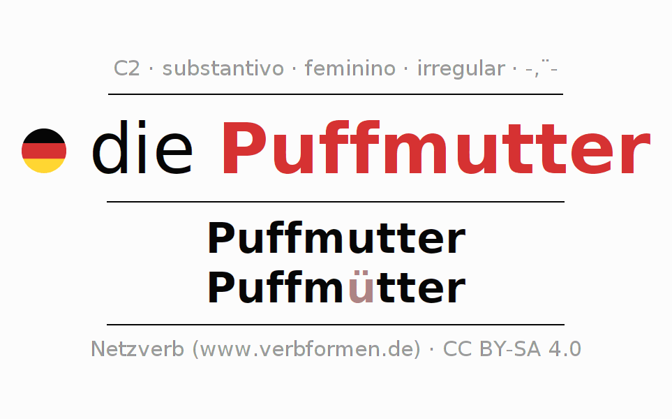 Declinação de Puffmutter é apresentada em uma tabela com todas as formas no singular e no plural (plural) e em todos os quatro casos: nominativo (1º caso), genitivo (2º caso), dativo (3º caso) e acusativo (4º caso) . Especialmente para os alunos de alemão, a correta declinação da palavra Puffmutter é fundamental.