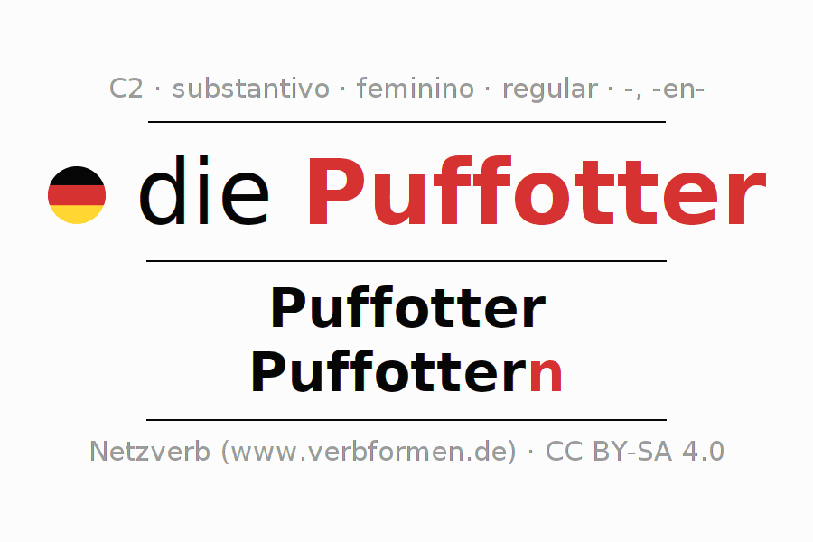 Declinação de Puffotter é apresentada em uma tabela com todas as formas no singular e no plural (plural) e em todos os quatro casos: nominativo (1º caso), genitivo (2º caso), dativo (3º caso) e acusativo (4º caso) . Especialmente para os alunos de alemão, a correta declinação da palavra Puffotter é fundamental.