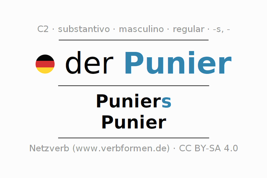 Declinação de Punier é apresentada em uma tabela com todas as formas no singular e no plural (plural) e em todos os quatro casos: nominativo (1º caso), genitivo (2º caso), dativo (3º caso) e acusativo (4º caso) . Especialmente para os alunos de alemão, a correta declinação da palavra Punier é fundamental.