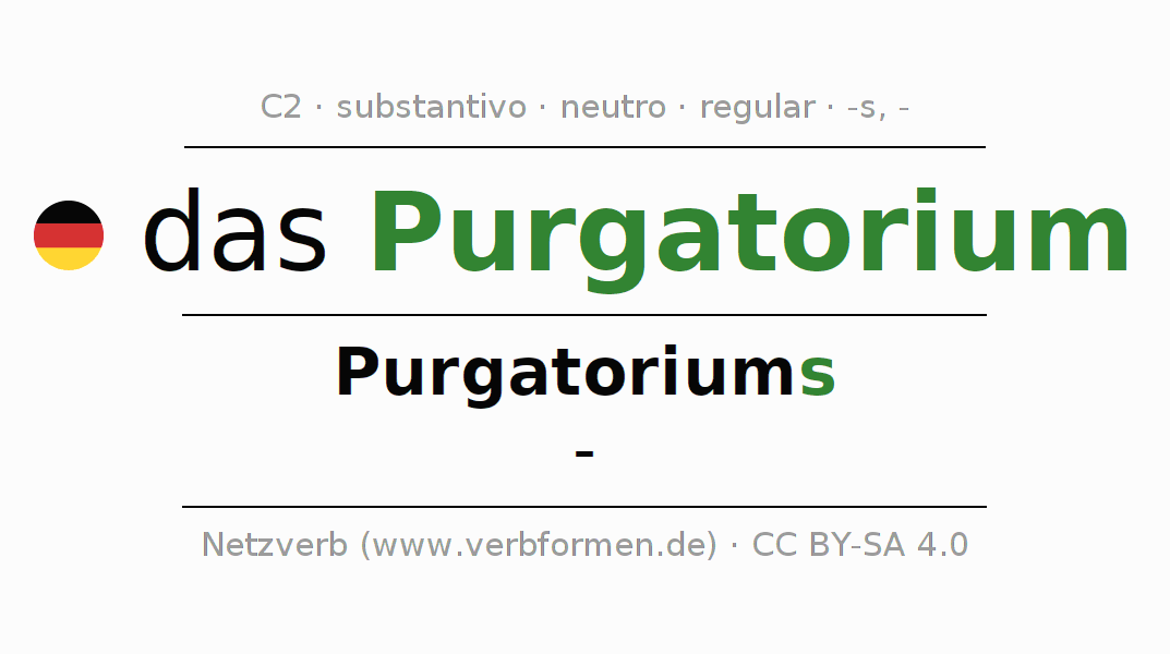 A declinação do substantivo Purgatorium (purgatório) está no genitivo singular Purgatoriums e no nominativo plural - . O substantivo forte Purgatorium é declinado com a terminação s/-. Não há formas no plural. O gênero gramatical de Purgatorium é neutro e o artigo definido é "das". Não se pode somente declinar o substantivo Purgatorium mas sim todos os substantivos em alemão. O substantivo faz parte do vocabulário referente ao Certificado em Alemão do Nível C2. Comentários ☆