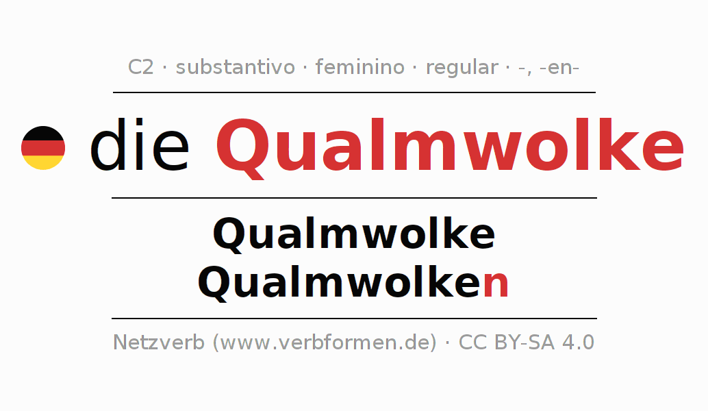 Declinação de Qualmwolke é apresentada em uma tabela com todas as formas no singular e no plural (plural) e em todos os quatro casos: nominativo (1º caso), genitivo (2º caso), dativo (3º caso) e acusativo (4º caso) . Especialmente para os alunos de alemão, a correta declinação da palavra Qualmwolke é fundamental.