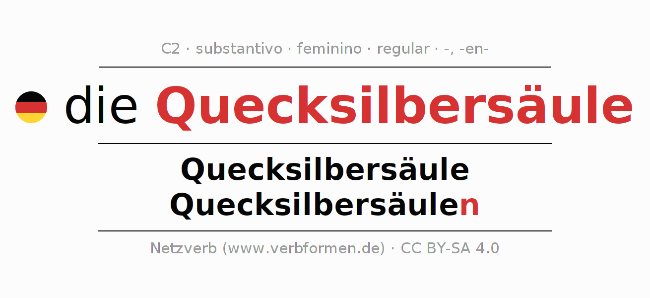 A declinação do substantivo Quecksilbersäule (coluna de mercúrio) está no genitivo singular Quecksilbersäule e no nominativo plural Quecksilbersäulen . O substantivo fraco Quecksilbersäule é declinado com a terminação -/n. O gênero gramatical de Quecksilbersäule é feminino e o artigo definido é "die". Não se pode somente declinar o substantivo Quecksilbersäule mas sim todos os substantivos em alemão. O substantivo faz parte do vocabulário referente ao Certificado em Alemão do Nível C2. Comentários ☆